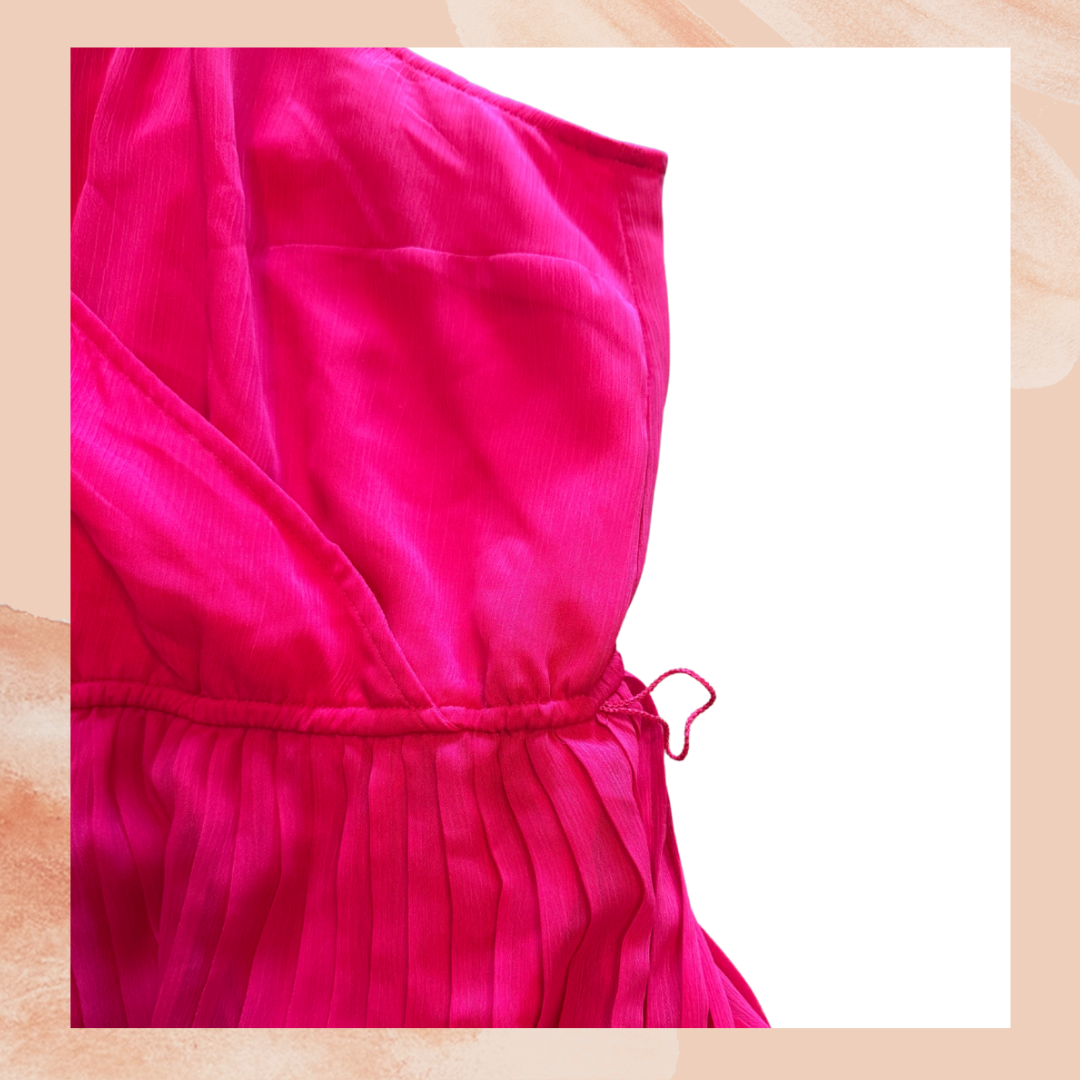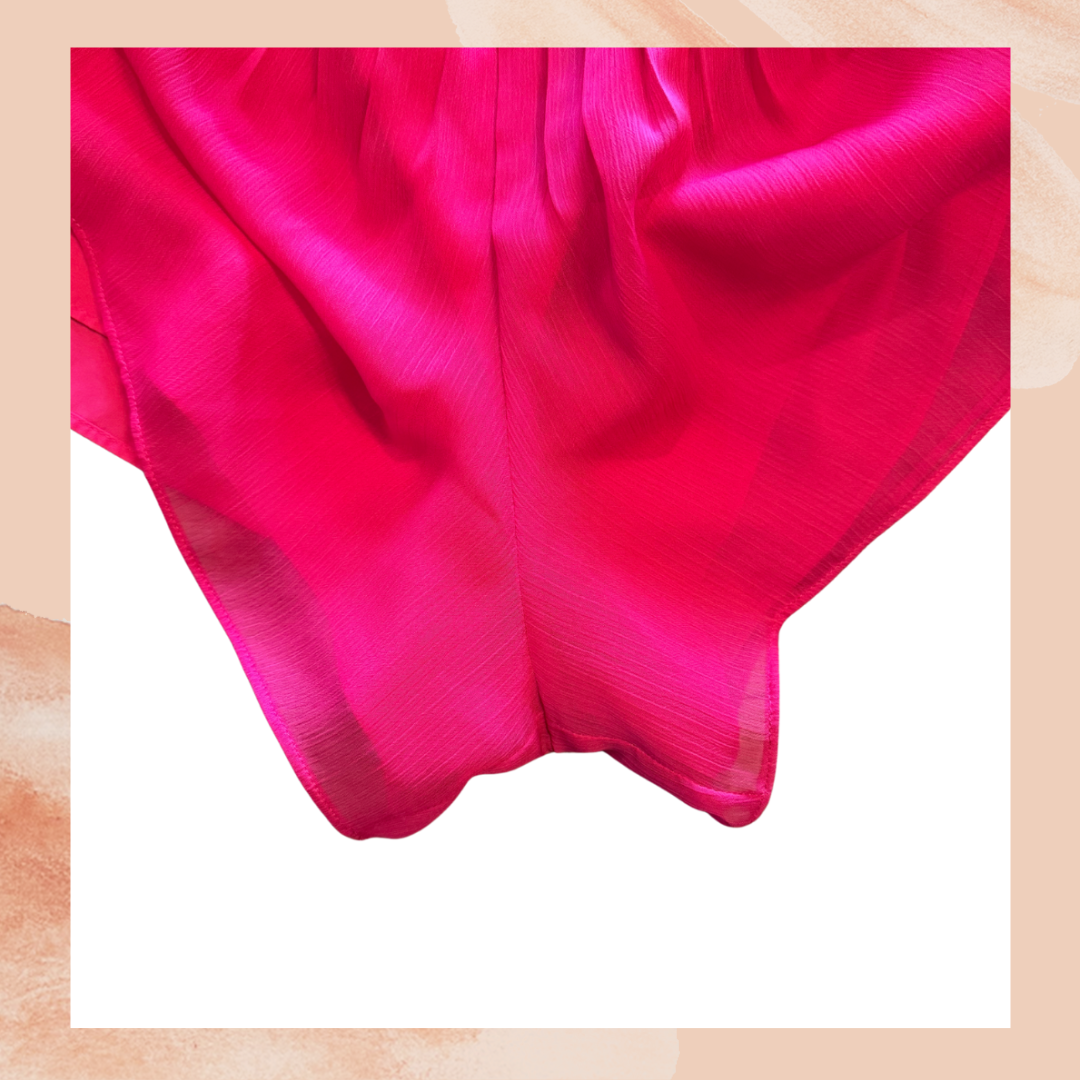 Pre-Loved. Pull on, bright hot pink, spaghetti strap, flowy, V-neck romper. In like new condition. Complete with elastic waist, and removable waist-tie belt (not shown in pictures), but included.