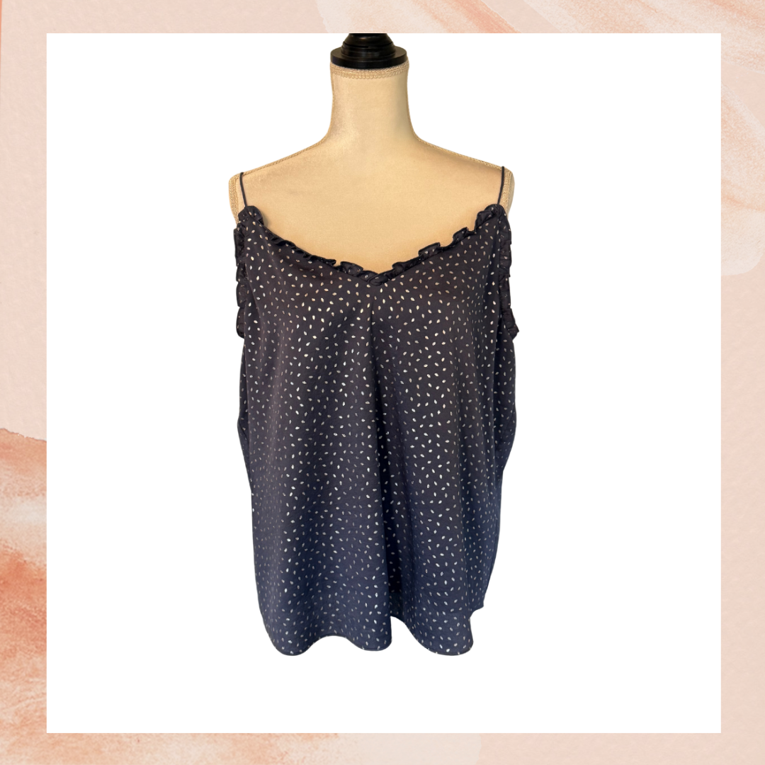 Pre-loved. Navy, spaghetti strap tank, with silver flecked print and ruffle trim detail. In great condition.