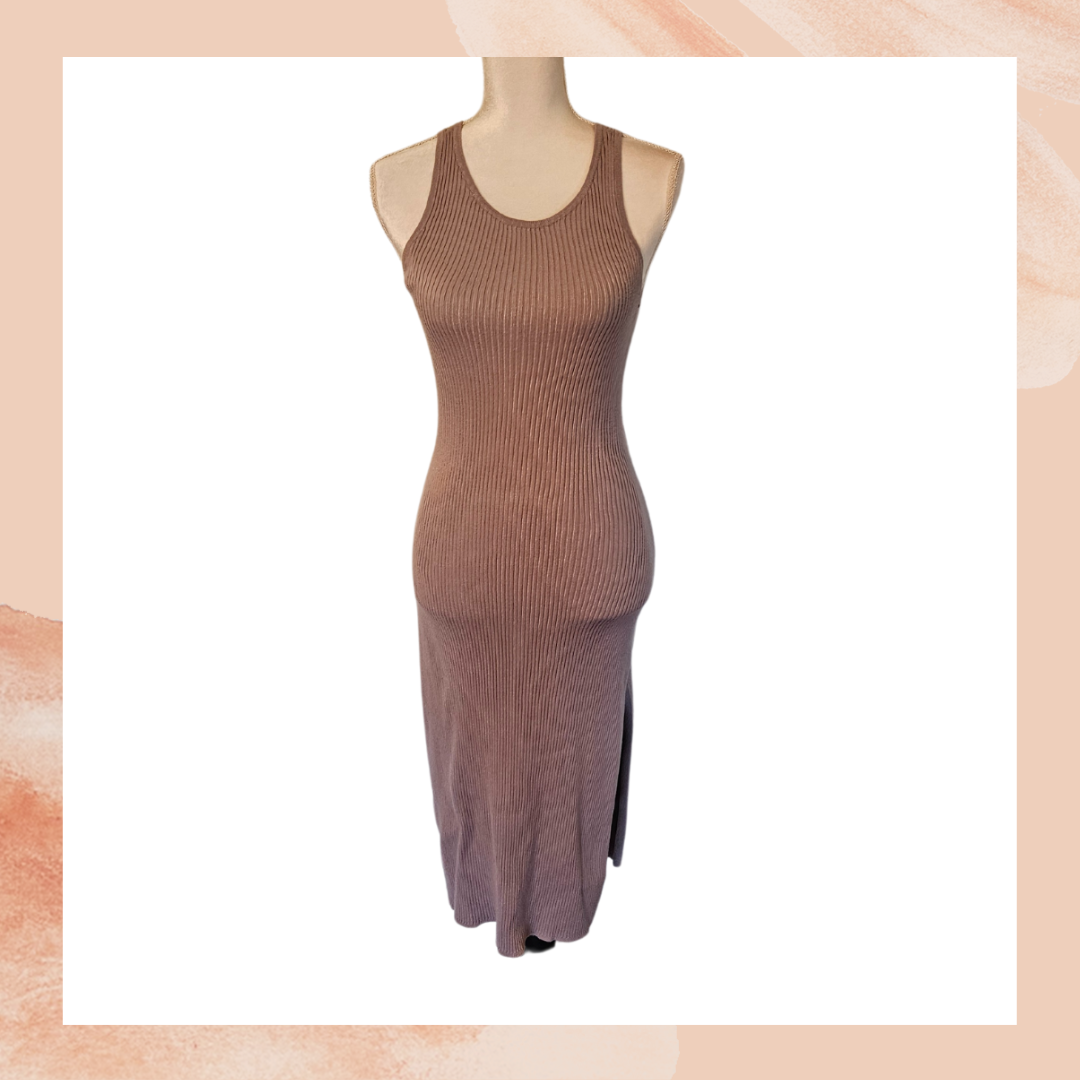 Pre-loved. Soft and stretchy, pullover, ribbed knit, sleeveless, bodycon midi dress with twist-knot, cut-out at back detail and side slit.