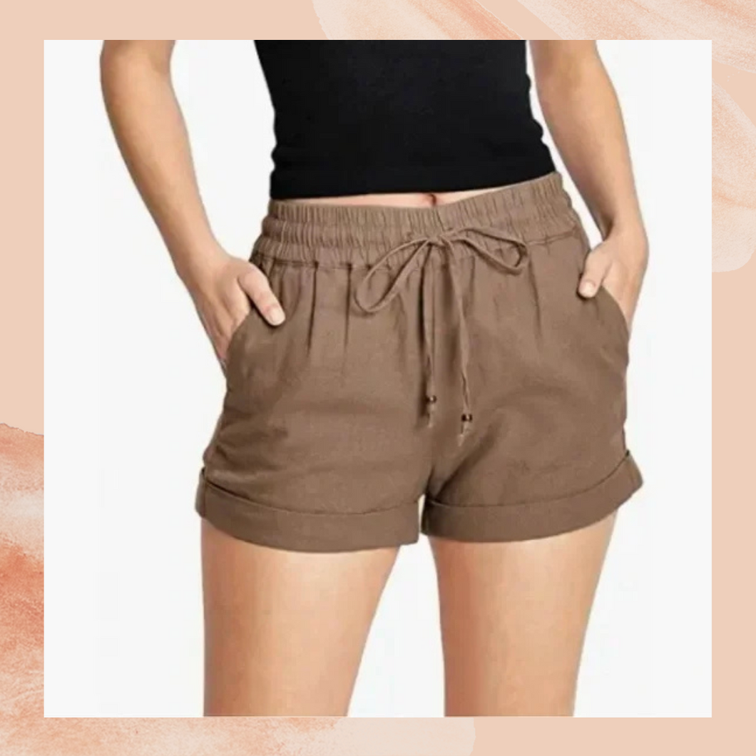 Pre-loved. Brown, casual, pull-on, cuffed, drawstring linen shorts with two front pockets for comfort.