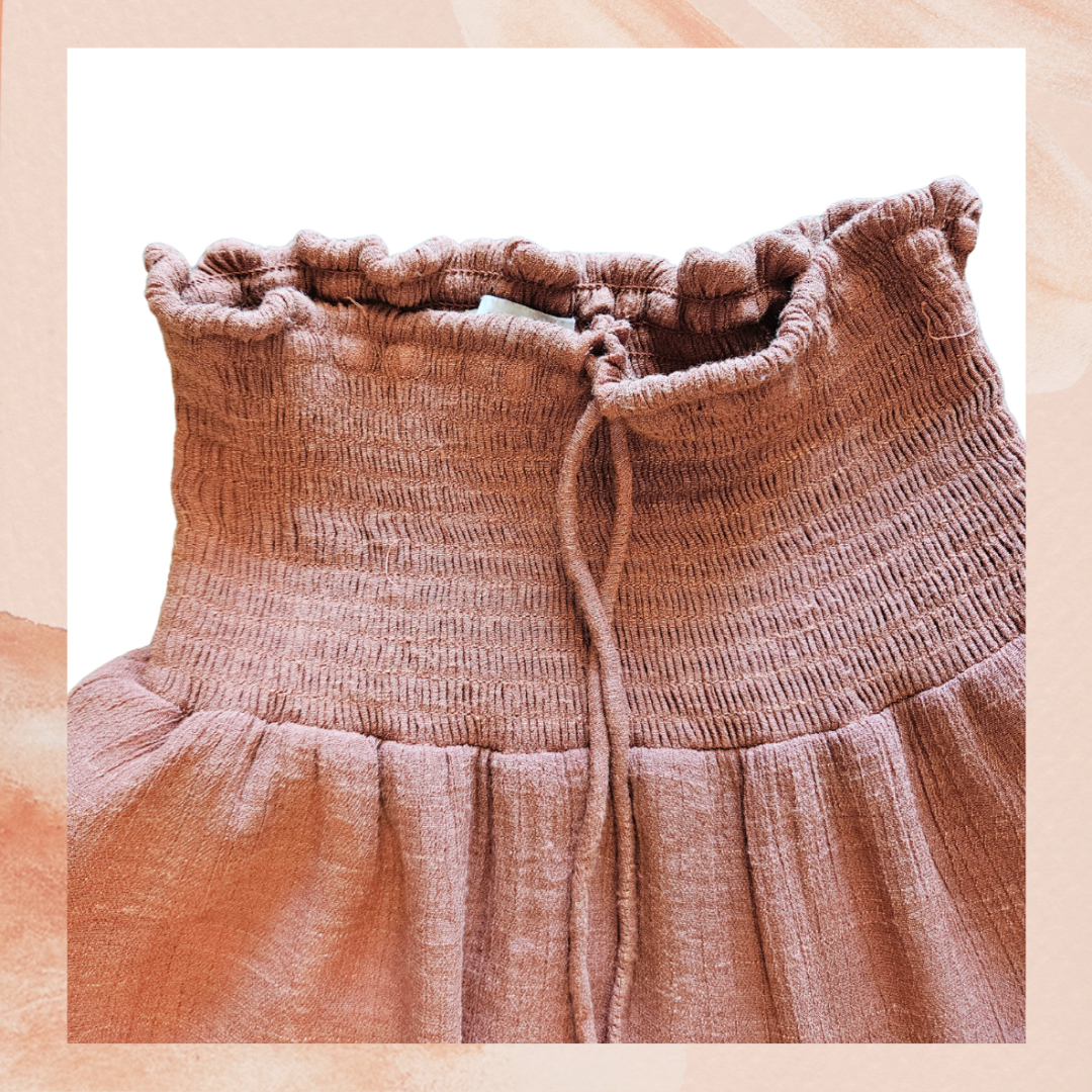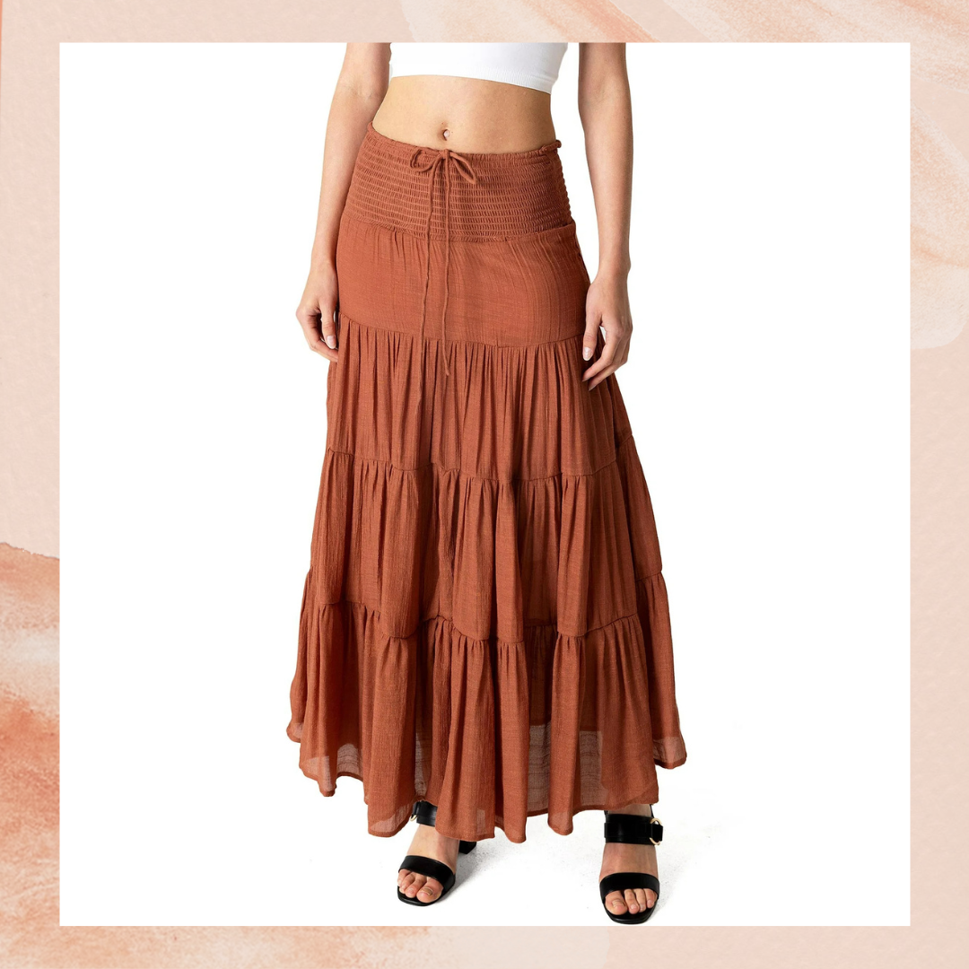 Pre-loved. Tiered, maxi boho skirt, with stretchy smocked waist, adjustable drawstring and partial lining. The perfect skirt for Fall!